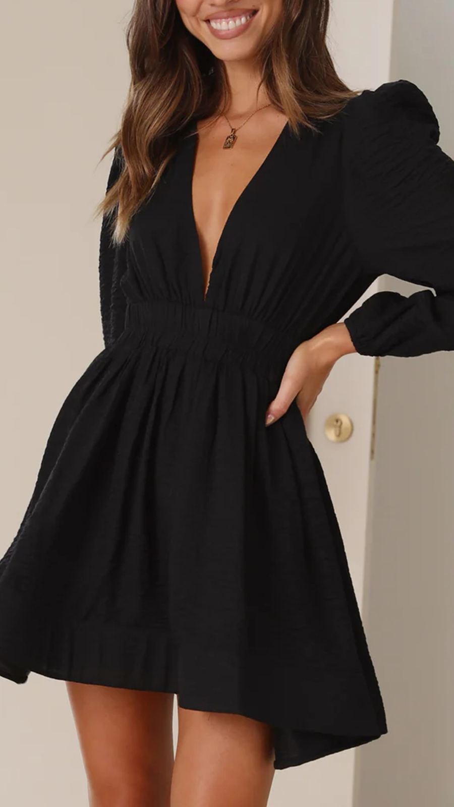 - Deep V neckline